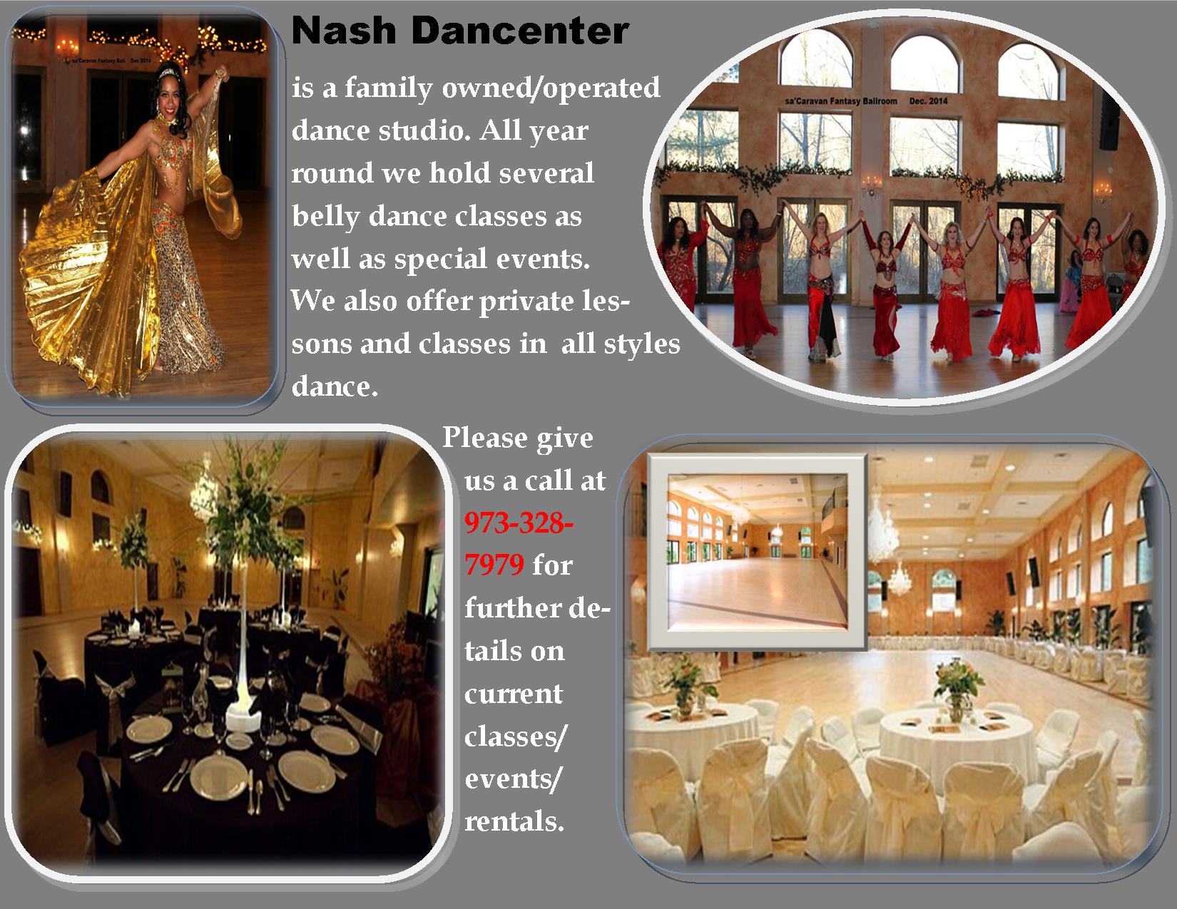Nash Dancenter is a family owned/operated dance studio. We love serving clients of all ages and providing a relaxing atmosphere for the community to learn, practice and socialize. All year round we hold several belly dance classes as well as special events. We also offer private lessons and classes in all styles of dance. Please give us a call at 973-328-7979 for details and current classes/events. Randolph www.nashdancenter.com